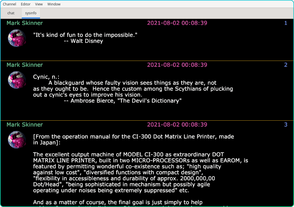 In their early years, social Media corporations showed great promise, but soon revealed themselves as hives of Left wing extremism, censorship and totalitarianism. Thus I was inspired, around the start of 2017, to slow work on Standard 3D to start work on a self hosted replacement for YouTube, Facebook, Twitter, Discord, etc, building on the basic functionality of IRC, but with stored messages.