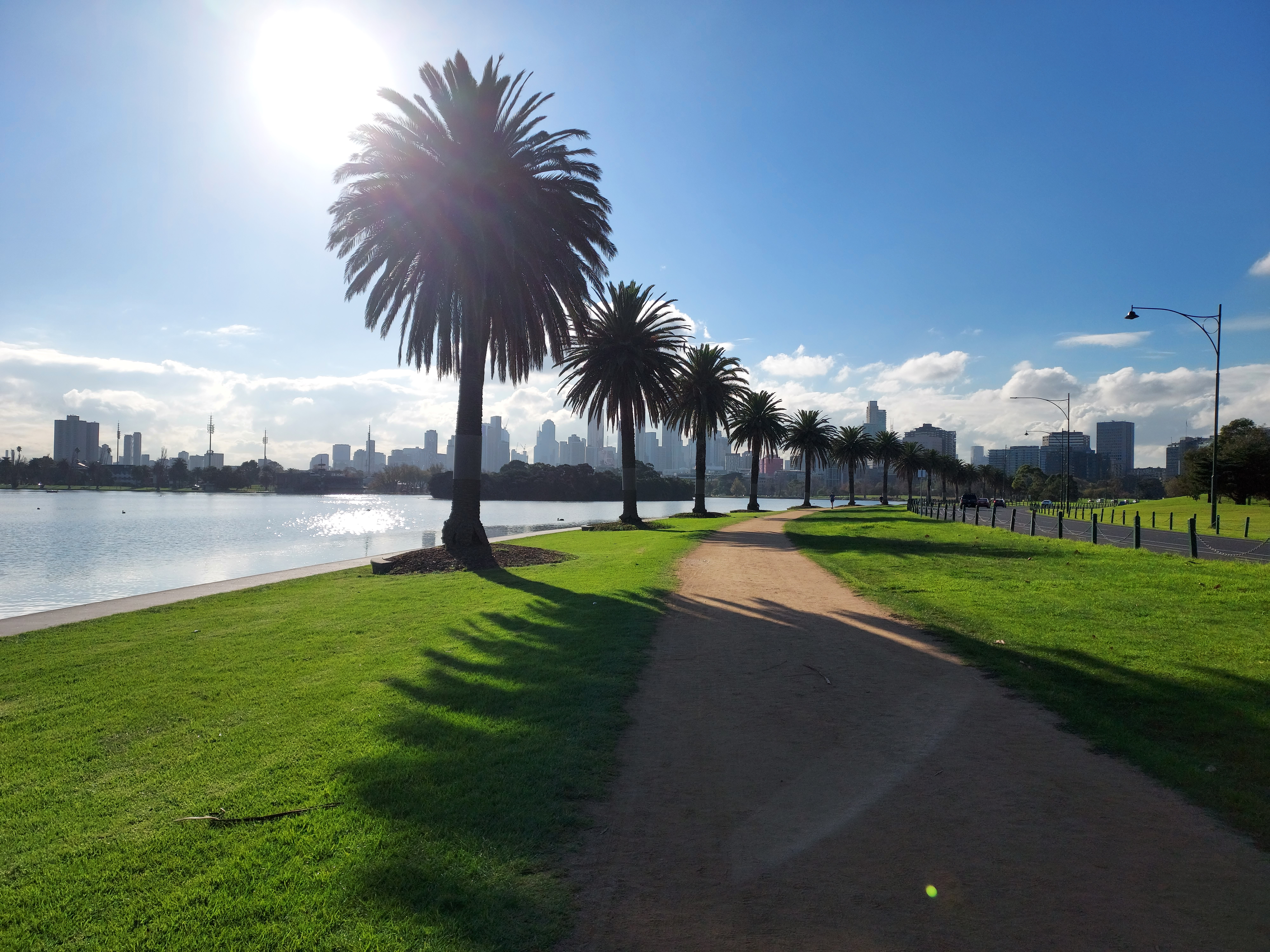Palm trees along Albert Park lake, with the city behind.